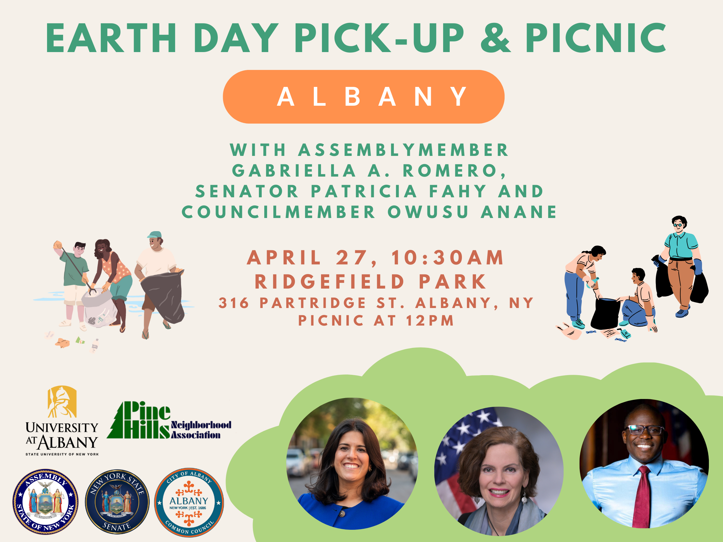 UAlbany students, faculty, and staff are invited to participate in the bi-annual Pine Hills Clean Up taking place in midtown Albany, followed by a community gathering in Ridgefield Park with Assemblymember Gabriella Romero and Senator Pat Fahy.