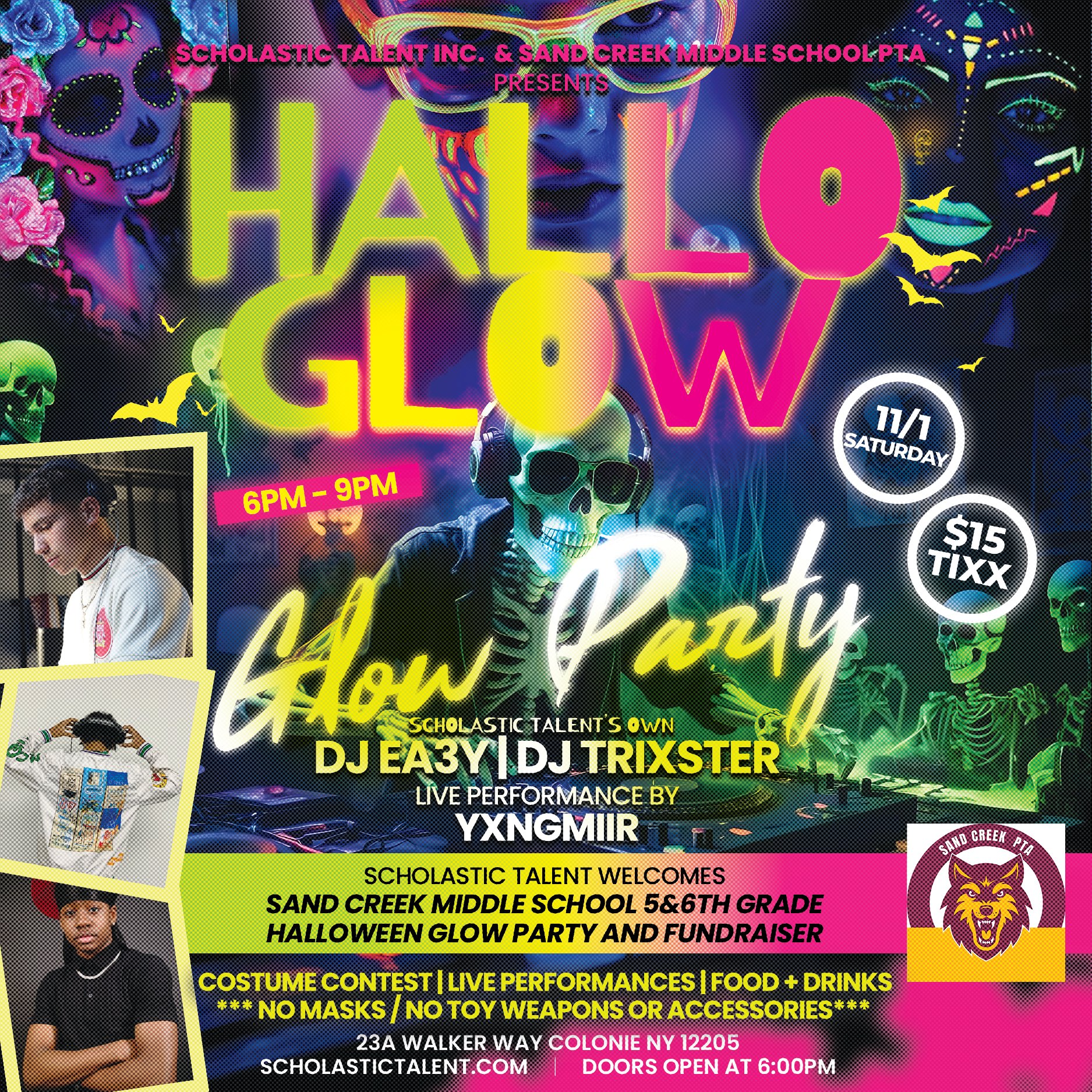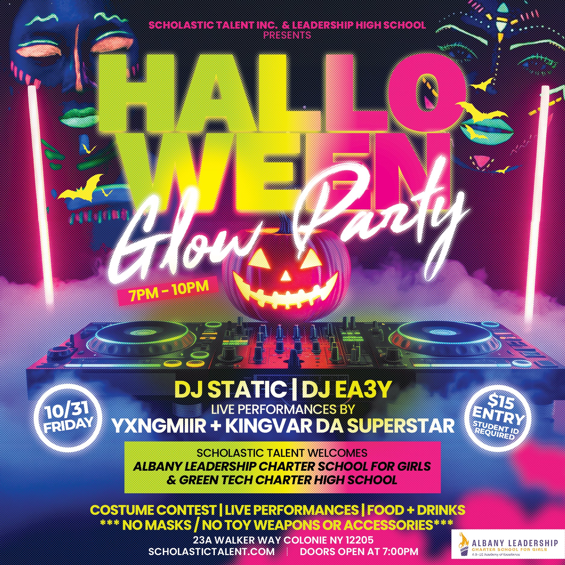 Scholastic Talent welcomes Albany leadership for girls, Green Tech Charter High School on 10/31/25 , And Sand-creek Middle School 5th & 6th Graders on11/1/2025 to our Halloween glow parties .