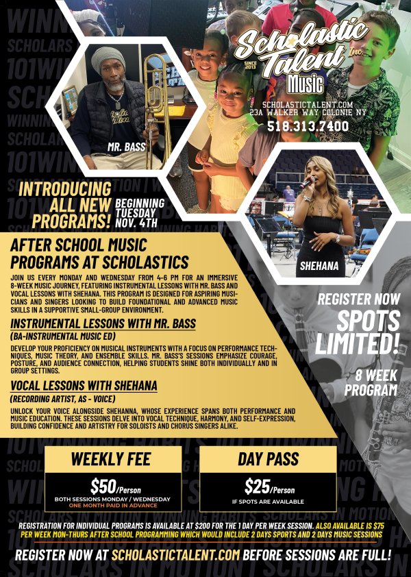 Happy New Year! Scholastic Talent is seeking volunteers for our spring afterschool programs. We are a nonprofit supporting youth through music, sports, and enrichment.