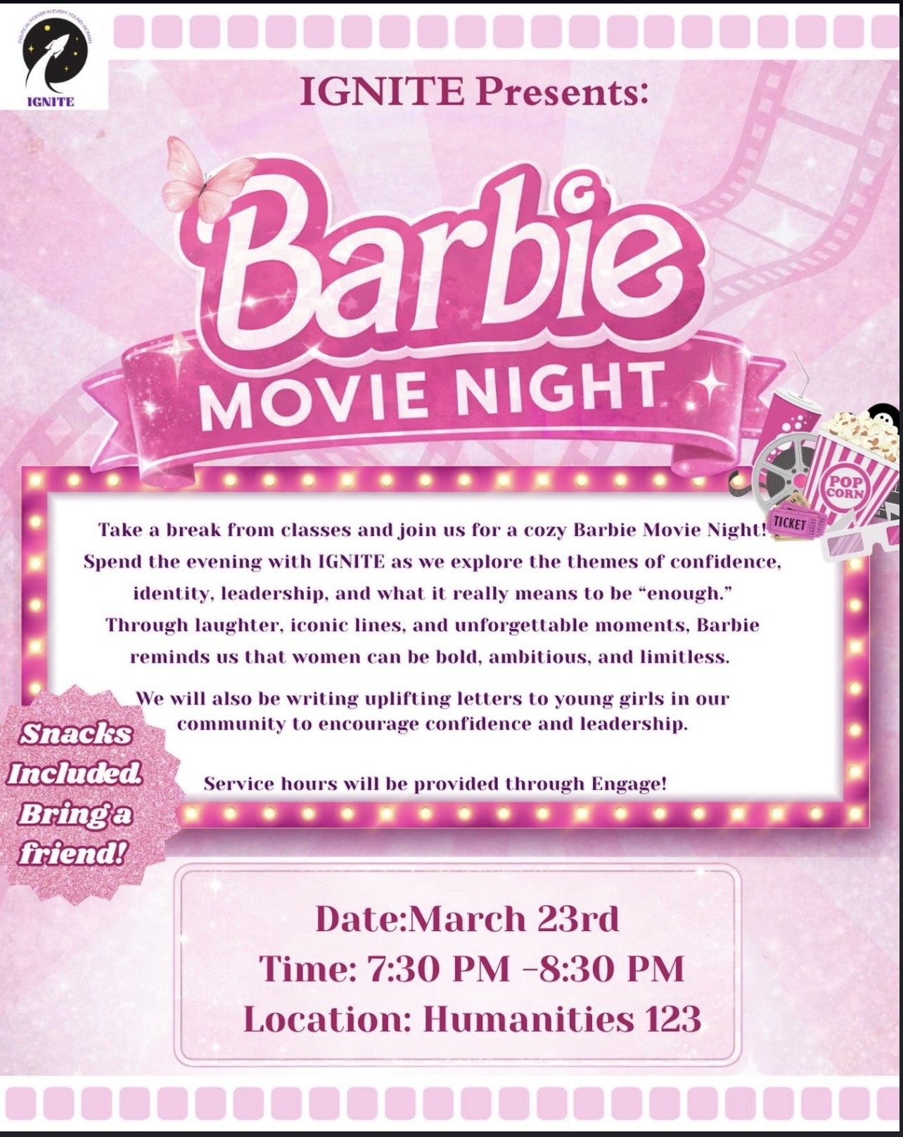 Start the second half of the Spring Semester off right with a Barbie Movie Night and Inspirational Letter Writing event on Monday, 3/23 at 7:30 pm in Humanities 123.